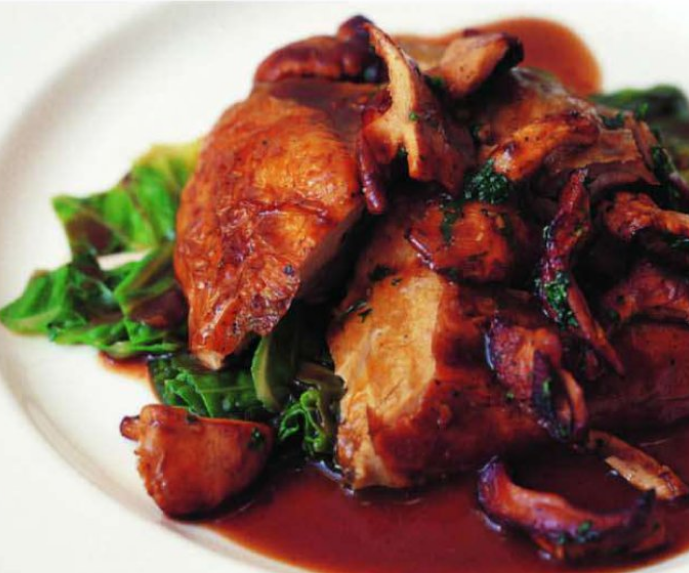 Отделите ноги и грудки курицы ножом. Разложите капусту по тарелкам, положите сверху куриные грудки, а затем сверху полейте соусом. Положите приготовленные шампиньоны сверху и подавайте к столу.