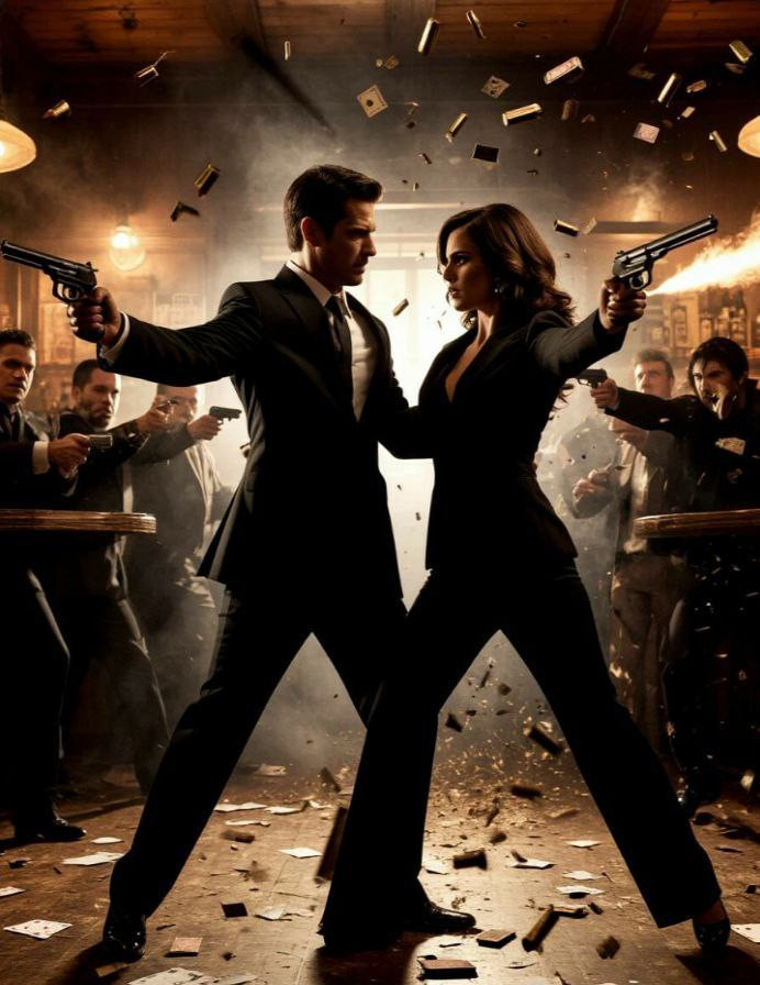 Страсть под прицелом... Бар "Эль Торо". Ночь. Интрига. Bailaor несёт свой чемодан. В нём - бриллианты, книга, Карта к кладу, в кабуре наган. Bailaora ждёт у стойки, Взгляд тревожный, в рюмке яд. Банда в зале, все на взводе, Главарь шепчет: "Где наш клад?" Bailaor садится рядом, Чемодан под стол кладёт. Обменявшись быстрым взглядом, Он бокал с вином берёт. Главарь банды встал, шатаясь, "Где алмазы?" - он рычит. Bailaora, улыбаясь, Кольтом тихо шевелит. Миг - и пуля просвистела, Главарь рухнул, как мешок. Началось меж всеми дело, Выстрелы, и кровь на пол. Bailaor достал свой кольт, С Bailaora в унисон Танец смерти, пуль разлёт, Бандитов крики, общий стон. Так случилось, что в погоне За богатством и мечтой, Страсти в баре на балконе Закружились под луной. Звон бокалов. Крик внезапный. Выстрел. Дым. Ещё один. Танец смерти. Ритм азартный. Кровь на картах. Стон мужчин. Он - как молния в движенье, Она - грация с огнём. Пули - музыка сраженье, Зал затих в дыму густом. Кружат в танц