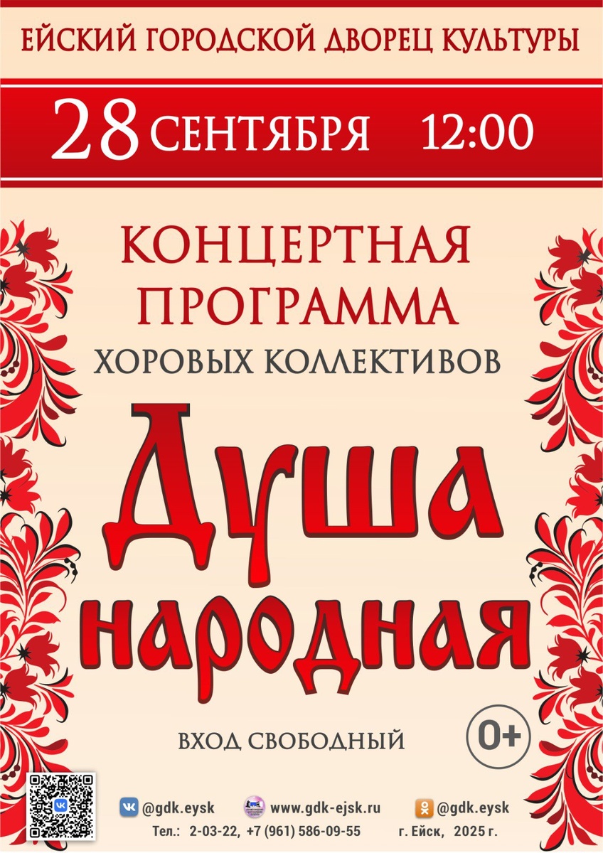 28 сентября в 12:00 Ейский городской дворец культуры приглашает всех ценителей народной песни на концерт хоровых коллективов центра народной культуры под названием «Душа народная». ▫ Вход свободный. В старину говорили: «Кто с песней живет, того кручина неймет». Во все времена песня всегда была рядом с человеком и в радости, и в горе, ведь с песней и дела спорятся быстрее, и работа кипит! Гости программы – участники народного коллектива поэтов и композиторов «Парус». Подписывайтесь: @gdk_ejsk