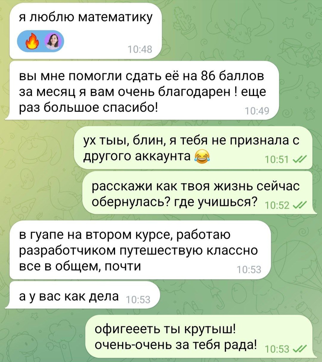 Всегда приятно видеть рост своих детей 💾 Сегодня нечаянно в рассылке отправила сообщение своему бывшему ученику. А он в ответ поделился своими результатами Хорошая подготовка к ЕГЭ открывает вам двери в большой мир с миллионами возможностей. Здесь вы получаете навыки, которые выделяют вас среди остальных: ответственность, коммуникабельность, умение работать в команде, аналитическое мышление и др. На занятиях мне важно не только ваши знания по математике, но и общее развитие. Всё это помогает прокачать работа в группах. Кстати, места еще есть, но прежде я приглашаю вас на консультацию. 💾 В следующие 10 дней вы сможете попасть на консультацию бесплатно. На ней мы с вами полностью составим ваш план подготовки к ЕГЭ и поступлению, а также ответим на все вопросы. Пиши — @manager_LanaMath 💾 Думаю пора написать всем своим ученикам, кто занимался 5 лет назад, и спросить кем они стали и сколько 💴