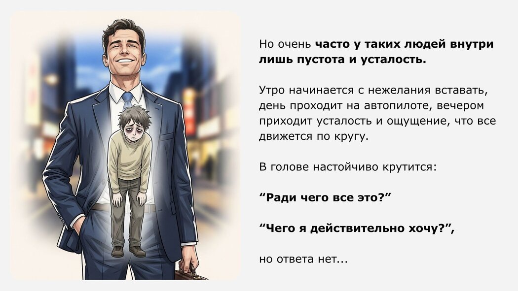 Вы наверняка знаете людей, у которых снаружи полный порядок: бизнес успешно работает, доход стабильный, проекты идут, любящая семья рядом. Ежедневник забит встречами и задачами, а соцсети – яркими фотографиями с улыбками. Но что же внутри.. Чтобы найти ответ и вырваться из замкнутого круга, важно глобально пересобрать маршрут жизни. Объективно увидеть: где вы на самом деле, чего хотите на самом деле, что вас держит, и как найти цель, которая одновременно дает результат снаружи и опору внутри.