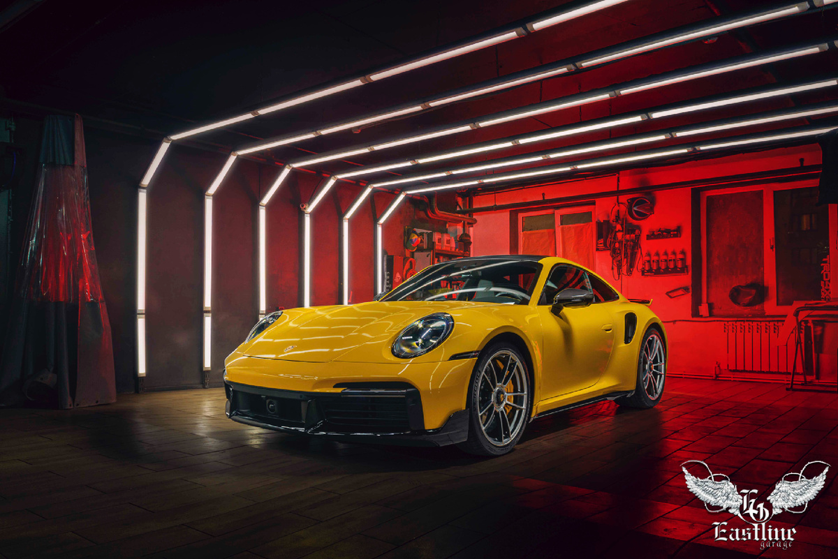Сегодня у нас в гостях Porsche 911 Turbo S – автомобиль, который смело можно назвать одним из самых совершенных во всем мире. Автомобиль с потрясающей динамикой и утонченным стилем, разработанный величайшими инженерами и дизайнерами. 911 Turbo S, определенно, любит гоночные треки. Но, к сожалению, случается и такое, что и на автодромах происходят аварии. Именно после подобного инцидента данный автомобиль и оказался у нас в студии Eastline Garage: нам доверили восстановить и доработать этот Порше. Для нашего коллектива не существует слова невозможно и с абсолютно разными задачами наша команда справляется на отлично. Мастера Eastline Garage выполнили ремонт передней и боковых частей кузова Порше и, само собой, поработали над его безупречным стилем. Инсталлировали пороги и сплиттеры, а тормозные суппорты перекрасили: они теперь ярко-желтые. Поскольку во время аварии сработали системы безопасности, наши специалисты занялись торпедо и полностью перешили ее в наппу, добавив акцент - желтую с