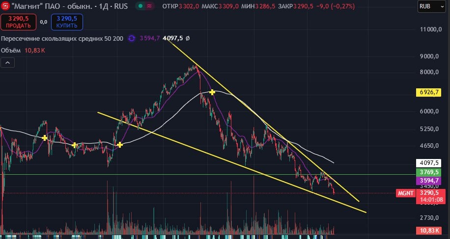 #Магнит #MGNT ‼️ Предыдущий разбор тут - https://dzen.ru/media/tradinvesti/mgnt-689d91e46f8eed0e73eaf171 - я писала про этот клин уже. ⚠️ Не смогли в прошлый раз пробить, но фигура пока что не сломана. 🔽 Цена идет к нижней стенке - 3100, может быть ложный пробой, но если не закрепится ниже, то пойдем пробивать клин и отрабатывать наверх. НЕ ИИР