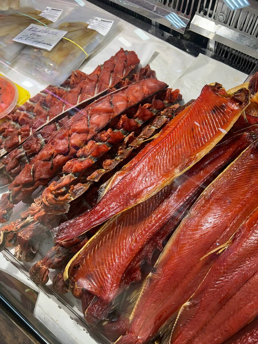 В Петропавловске-Камчатском отличный рынок: новый, чистый, аккуратный, большой. И с отличным выбором местного продукта. За каждым прилавком – по 4 жбана икры: чавыча, нерка, кижуч, горбуша. Чавыча – самая сливочная и нежная, нерка – самая насыщенная; Красная рыба всех видов (особенно хороша юкола: не сильно завяленная, мягкая, с очень насыщенным рыбным вкусом, и очень деликатно копченая рыба); корюшка вяленая и соленая; олюторская сельдь – разделанная и целыми тушами, и уже разделанная и нарезанная копченая красная рыба в масле с перцем и лавровым листом, "не забудьте хлебушка, масла не надо, и водочки" – советовали продавцы; Шикарные белые грибы, маринованный папоротник, протертая жимолость, брусника, голубика с сахаром; Интересный сыр – типа косички, но с жимолостью, с фиолетовыми пятнышками, и питьевой йогурт с шикшей. 🗺 Рынок 6 км Петропавловск-Камчатский, Проспект 50 лет Октября, 16 🧂 @saltmagazine