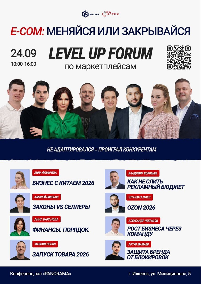 Совсем скоро в Ижевске состоится бизнес форум по маркетплейсам «Меняйся или закрывайся. Новый уровень!» Приглашаю всех кто связан с бизнесом на маркетплейсах или только решает начать продавать на онлайн площадке! Будет интересно🔥 От меня по промокоду POPOV скидка 15%. Регистрируйся здесь https://sellers18.ru/fforum