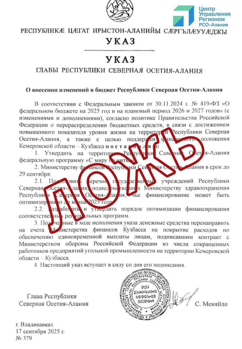 В соцсетях распространялась ложная информация — документ якобы подписанный Сергеем Меняйло, где говорилось о несуществующей федеральной программе «С миру по нитке» и оптимизации системы здравоохранения с последующим направлением средств в другой регион. ЦУР Северной Осетии (@tsur15) проверил информацию и заявил, что такого указа нет ни на одном официальном ресурсе. В оперативном штабе республики также подтвердили, что глава региона подобных документов не подписывал.