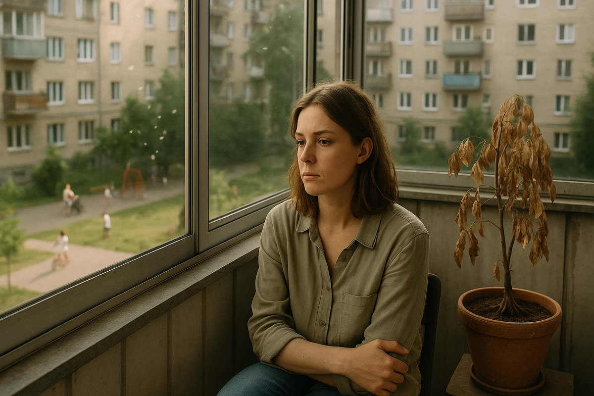 Внизу по асфальту шлёпали дети в сандалиях, кто-то запускал мыльные пузыри, кто-то гонял на самокате, визжали так, что было слышно на девятом этаже. А у неё всё внутри было тихо, как будто кто-то выключил звук.