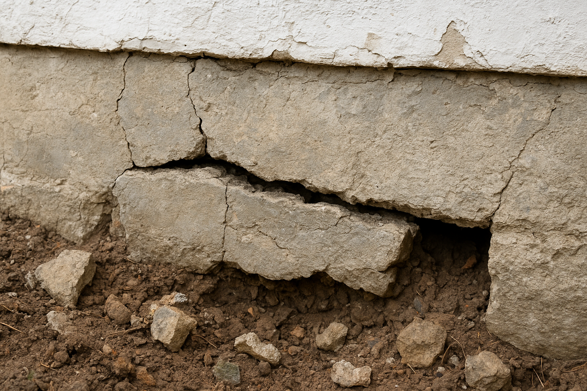 - Расслоившаяся кладка фундамента или выпавшие из неё камни, обычная проблема бутовых фундаментов.
