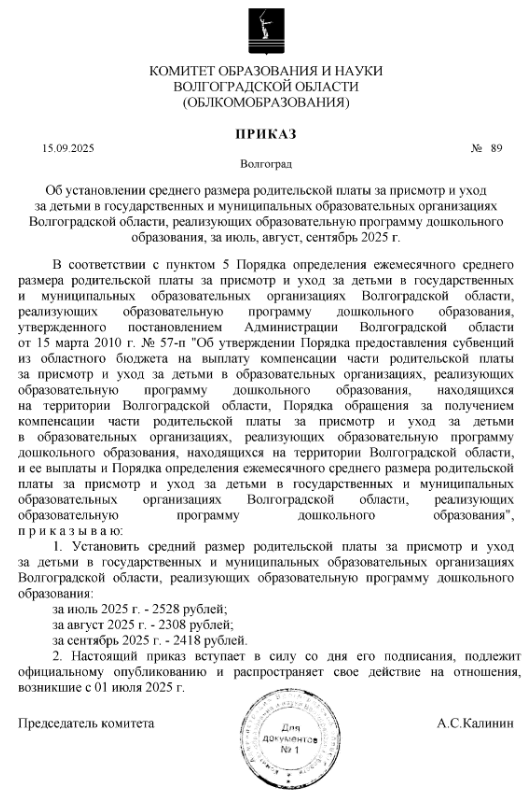 На сайте администрации Волгоградской области появился приказ об установлении среднего размера родительской платы за присмотр и уход за детьми в государственных и муниципальных образовательных организациях. Стали известны расценки за пребывание малышей в дошкольных учреждениях региона с июня по сентябрь. Так, в июле 2025 года плата за детсад составляла 2528 рублей, в августе — 2308. А вот в сентябре эта сумма немного выросла и составила 2418 рублей. Если сравнивать стоимость детсада за текущий месяц и июнь, то она повысилась более чем на 300 рублей. В первый месяц лета эта сумма составляла 2088 рублей. А в мае родители в среднем платили по 1978 рублей. В апреле цены были выше — 2417 рублей.