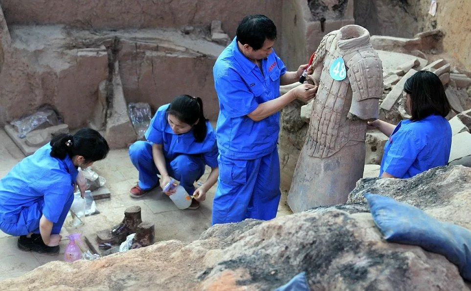 У китайцев провинции Сиань существовало многовековое поверье ― не тронь всё найденное в земле, на артефактах может быть наложено древнее проклятье. И поэтому местные жители старательно обходили стороной все находки. Но одна находка оказалась настолько масштабной и зрелищной, что пришлось призвать учёных, которые начали раскопки. В 1974 году, крестьянин Янь Джи Ван, возделывавший свой участок у горы Лишань, решил копать колодец. На глубине 5 метров лопата наткнулась на что-то твёрдое. Селянин уже хотел прекратить раскопки и начать копать колодец в другом месте, тем более что вода в этом месте так и не появилась, но напоследок решил снять ещё пару штыков грунта. И несказанно удивился, увидев, что из земли торчит... голова. Голова оказалась глиняной и очень древней. Землевладельцу пришлось пригласить ученых, которые были потрясены, ведь ранее о периоде первом императоре династии Цинь ― Цинь Шихуанди, было известно немного, а тут целый пласт культурного наследия. Выяснилось, что под земле