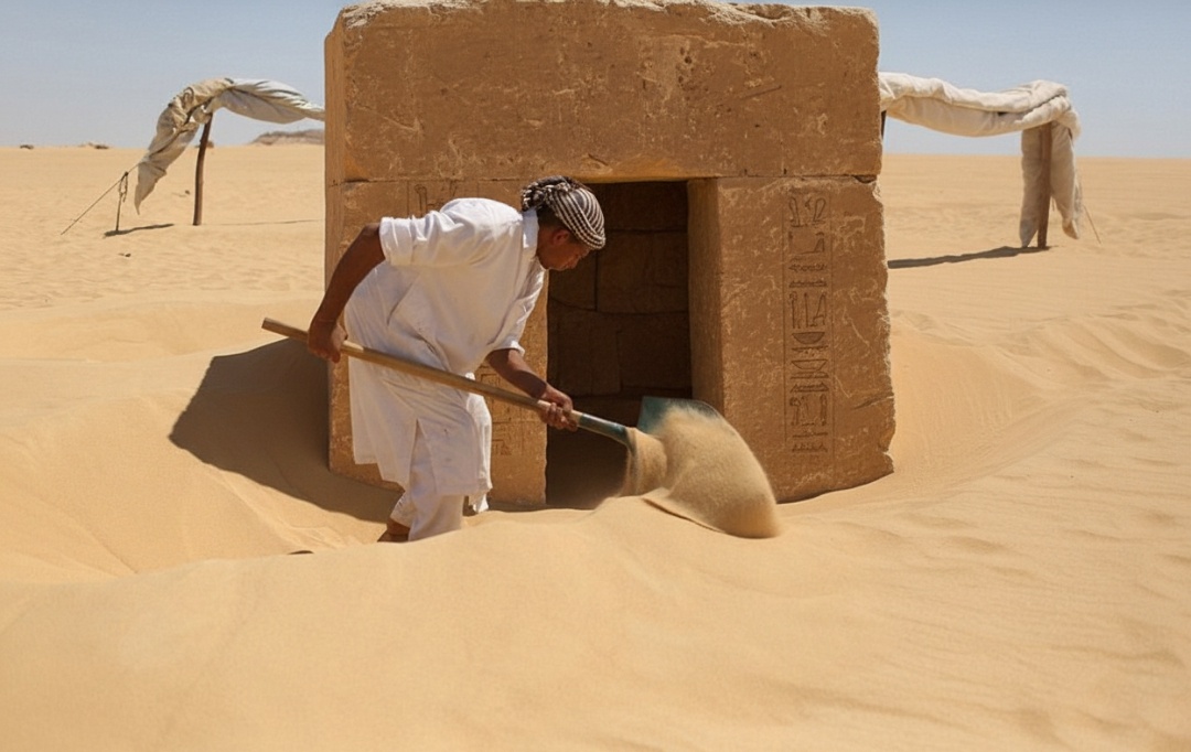 В 2020 году над этим мужчиной все смеялись, якобы что он сошел с ума, ищет в пустыне на месте, где сплошные зыбучие пески, неизвестно что. Но мужчина и его брат не обращали внимания на слухи, они продолжали что-то искать. Никто не знал, что братья ищут в песках недалеко от одного египетского поселения. Братья каждый день запускали коптеры над песками и часами что-то записывали, фиксируя с неба какие-то координаты. И не напрасно все это делалось. Вскоре старший брат обнаружил невидимый для глаза путь. Благодаря своим вычислениям он смог пройти сквозь засасывающие пески и начал откапывать что-то каменное, которое показалось из-под насыпи. Вскоре братья перелопатили огромную кучу песка, из-под которой они увидели каменный вход. На стенах которого виднелись древние письмена. Вход напоминал чем-то лифт, ведущий в шахту, а когда всё было очищено, то предположение о лифте подтвердилось: это был спуск, ведущий куда-то вниз и неизвестно на сколько метров. Только как он работал, братья не знали,