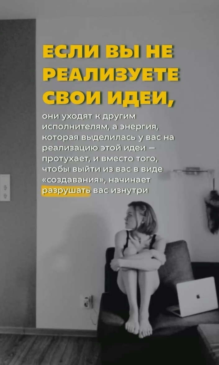 Если вы не реализуете свои идеи, они уходят к другим. А энергия, которую вы потратили на создание, начинает разрушать вас изнутри. Каждый из нас сталкивается с моментом, когда идеи и мечты остаются лишь мыслями. Вы тратите время на сомнения, вместо того чтобы действовать. И в итоге ваши идеи реализуют другие, а вы остаетесь с чувством неудовлетворённости и разочарования. Когда вы не реализуете свои идеи, вы теряете не только возможности. Вы теряете веру в себя, энергию и уверенность. Ваши идеи — это ваш потенциал, ваш вклад в мир. Если вы не действуете, они остаются невостребованными, а ваша энергия начинает работать против вас. продолжение здесь https://t.me/lifecidvishes/2693