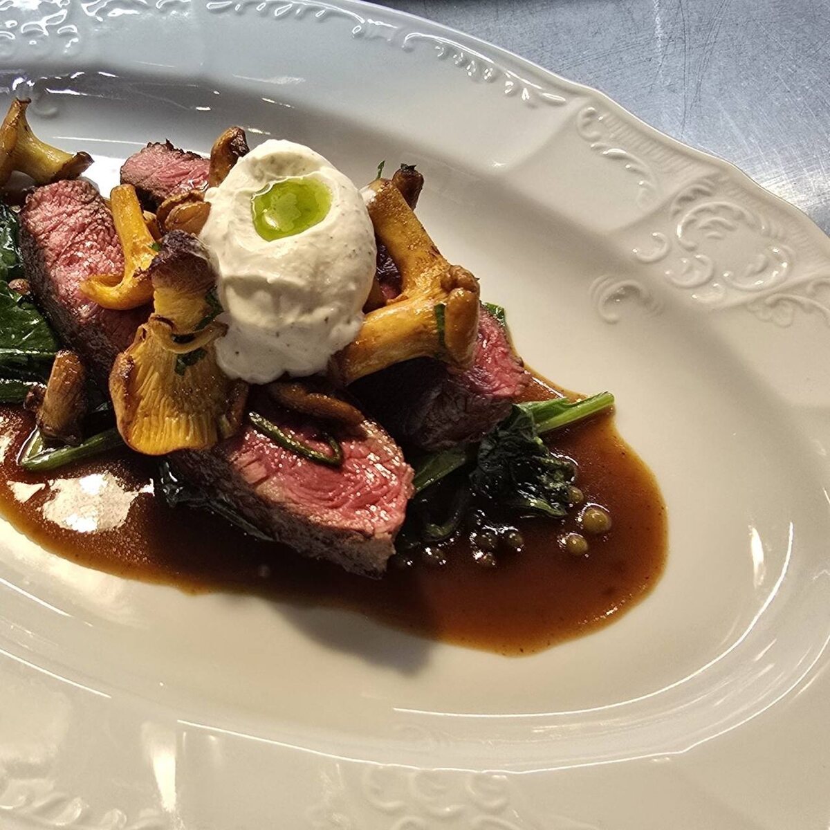 Стейк из вырезки с лисичками и трюфельной сметаной