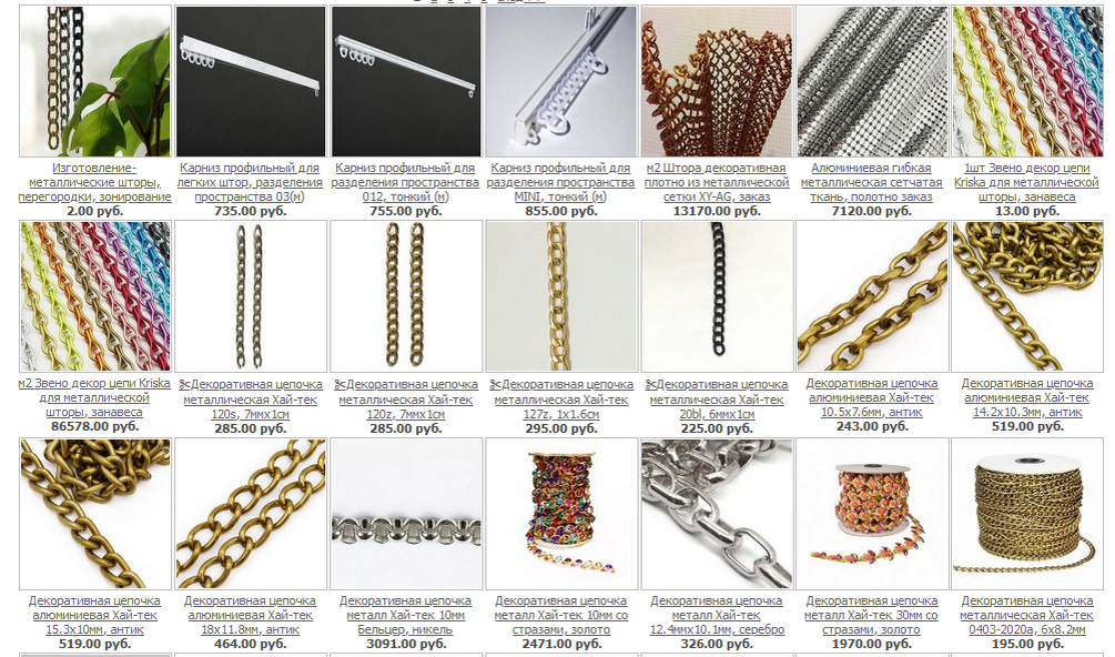 Декоративные ювелирные цепочки разнообразны по дизайну, размеру, форме, цвету и используются при украшении текстильных изделий, а именно могут быть применены на платьях, брюках, юбках и шубах. Декоративные металлические цепочки также являются аксессуаром к джинсам, или ручкой к сумке. Металлические шторы (металлический занавес) используются как