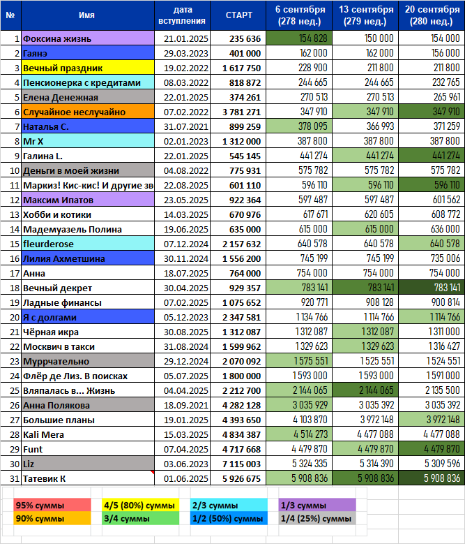 Всем привет! Как ни старалась я не затягивать с подведением итогов, всё равно не очень получилось. Вот уже суббота, а у меня только дошли руки до публикации. Ну ничего, заодно сразу же проведем и сбор данных. Неделя выдалась... не знаю, хорошая ли, плохая ли, судите сами. Могу сказать лишь, что она выдалась спокойная, без особых событий: Прогульщиков многовато, да ещё и не по первому прогулу у некоторых. Исправляйтесь! Никого не хочется исключать. Москвич в такси погасил 13196р и занял первое место! С небольшим отрывом второе и третье места занимают Пенсионерка с кредитами с результатом 11900р и Хобби и котики - минус 11833р. Поздравляем! Пенсионерка с кредитами, погасила 4,86% от долга и получила золотой кубок. Серебро получает Гаяне, погасившая 3,7%. Ну а на бронзу - Хобби и котики, с результатом минус 1,91%. Поздравляем! Также не было изменений цвета. В карусели таблиц вы можете увидеть результаты всех марафонцев: На этом всё. Все большие молодцы, бежим дальше, достигаем новых верши