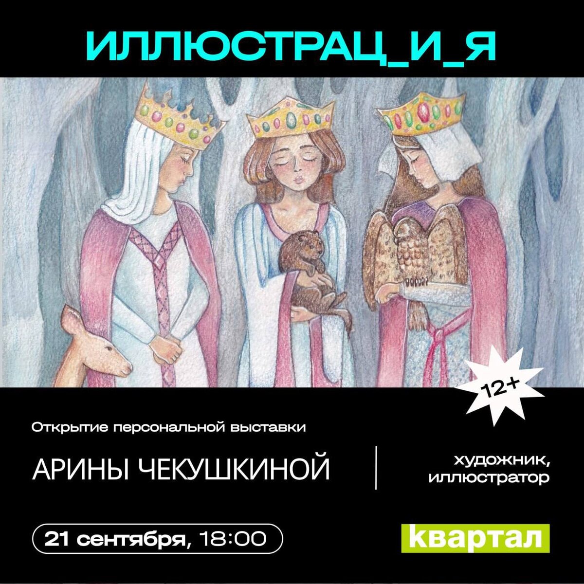 Открытие выставки Арины Чекушкиной "Иллюстрац_и_я" 🗓️ 21 сентября, 18:00 📍Квартал, Ленина 78 Выставка иллюстраций к музыке, стихам и возникающим образам. Своеобразный итог пути, длинной в тридцать три года жизни. Арина Чекушкина - художник, иллюстратор. Работает, в основном акварелью и карандашами, стараясь извлекать максимум возможностей для отображения образа. На выставке будут представлены иллюстрации к песням группы "Мельница", Kira Winter, к прошлым и будущим литературным произведениям разных авторов. Трогательные и изящные образы соседствуют со смелыми и решительными, наделенные глубиной и близкие каждому, уходящие корнями в самые различные культуры они проводят каждого зрителя в мир сказок и историй, придуманных авторами и воплощенных художником. На открытии выступит группа флейтапарус. Вход свободный 🏷️ #21сентября25