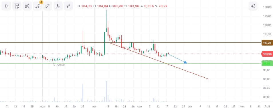 Актив находится в фазе нисходящего тренда, цена демонстрирует неспособность преодолеть ключевые уровни сопротивления. При объеме позиции в 6% и выставлении стоп-заявки на уровне 110,28 руб. риск на портфель составит 0,37%. Соотношение прибыль/риск составляет 0,83.
