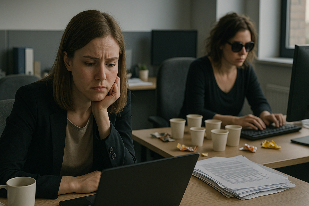 На соседнем столе скопились чашки и пустые обёртки от батончиков. Их хозяйка — Лена — снова опоздала и вошла, не здороваясь, с огромными чёрными очками на пол-лица. Села, включила монитор и стала что-то судорожно печатать, будто пыталась догнать поезд, который уже уехал.
