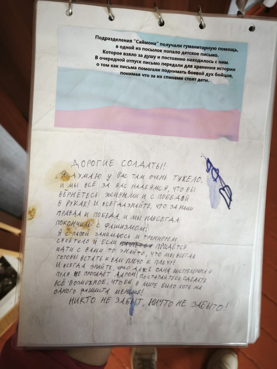 💌 В альбоме библиотечной выставки хранится письмо, полученное с гуманитарной помощью. Это письмо целый год "Саймон" хранил в своем кителе.