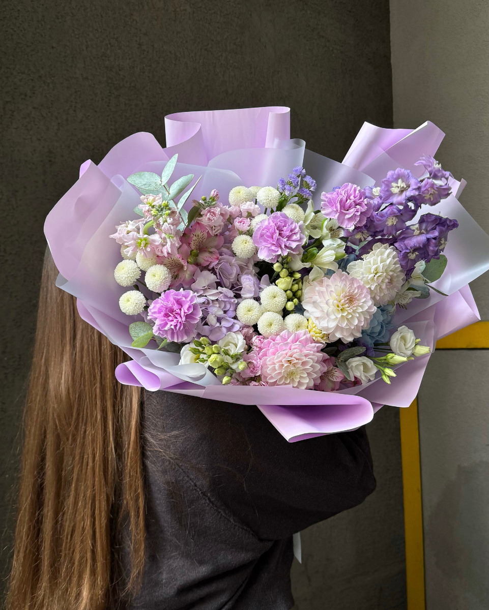 Нашей мастерице Анастасии выпал шарик с названием «Киндер-сюрприз». За основу она взяла концепцию гендер-пати – сюрприз для всей семьи, ставший праздником. Поэтому и цвета в букете гендерно-бинарные: тут и голубая гортензия, и белая эустома, и фиолетовый дельфиниум, и хризантема притаилась. Такая роскошь подойдет как на выписку из роддома, так и на подарок без повода. «Киндер-сюрприз» – 15.000₽ с доставкой. Замараться в шоколаде
