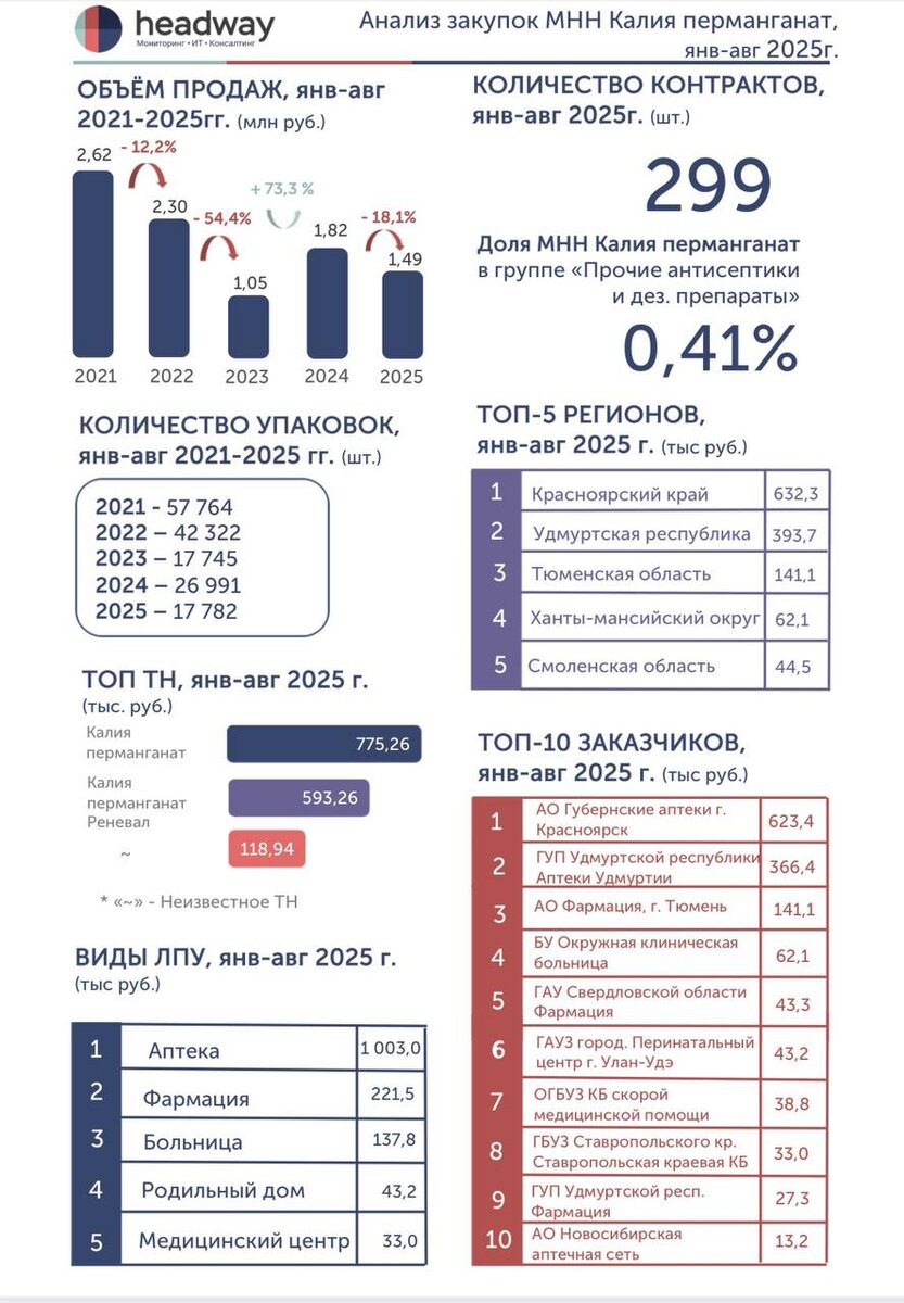 Минздрав утвердил новые правила хранения (приказ №260н от 29.04.2025). Перманганат калия признан и прекурсором, и взрывчатой субстанцией, поэтому его обязали хранить по строгим нормам как и наркотические, и психотропные вещества, а также прекурсоры(п.26). Эксперты уточняют: решающим фактором является концентрация ≥45%. Позиция Минздрава подтверждена письмом №25-4/7893 от 28.08.2025. ⚠️ К сожалению, не исключено, что новые правила приведут к исчезновению марганцовки из аптек. ОСНОВНЫЕ ТРЕНДЫ 🔶Объём продаж Если сравнивать данные за полный год, то наблюдаем рост в 2022 году - 3,86 млн руб. к 3,07 млн руб. в 2021г (почти +20%). Потом резкое падение в 2023 году почти вдвое - 1,99 млн руб. В 2024 наблюдался небольшой отскок вверх - 2,19 млн руб. (+10%). Данные за период «январь-август» демонстрируют колебания: пик закупок пришелся на 2021г. - 2,62 млн руб., далее идет снижение объёма закупок с минимальными продажами в 2023г. - 1,05 млн руб. В 2024г. объём закупок увеличился на 73%, а в 202