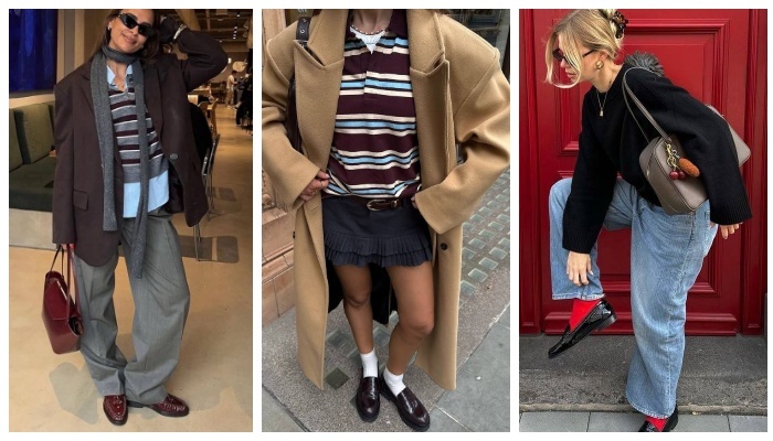 Осень диктует новые правила стиля: удобство и элегантность выходят на первый план. Лоферы — именно та обувь, которая идеально отвечает этим требованиям. Классическая форма, устойчивый каблук и универсальность делают их главным трендом сезона. На примере нескольких стильных образов можно проследить, как лоферы гармонично вписываются в разное настроение и эстетику. Лоферы бордового оттенка в сочетании с белыми носками и мини-юбкой отлично дополнили ансамбль длинное пальто и рубашка-поло в полоску. Такой аутфит напоминает о британской школьной эстетике и отлично работает в городских условиях. В данном образе лоферы становятся частью многослойного образа с широкими брюками, рубашкой и полосатым поло, надетым под оверсайз-жакет. Бордовая сумка и тёмный шарф придают комплекту глубину и завершённость. Лоферы здесь играют роль базы, которая уравновешивает богатую фактурность и расслабленный силуэт. Пример того, как лоферы легко могут стать частью повседневного street-style: чёрные модели в соч