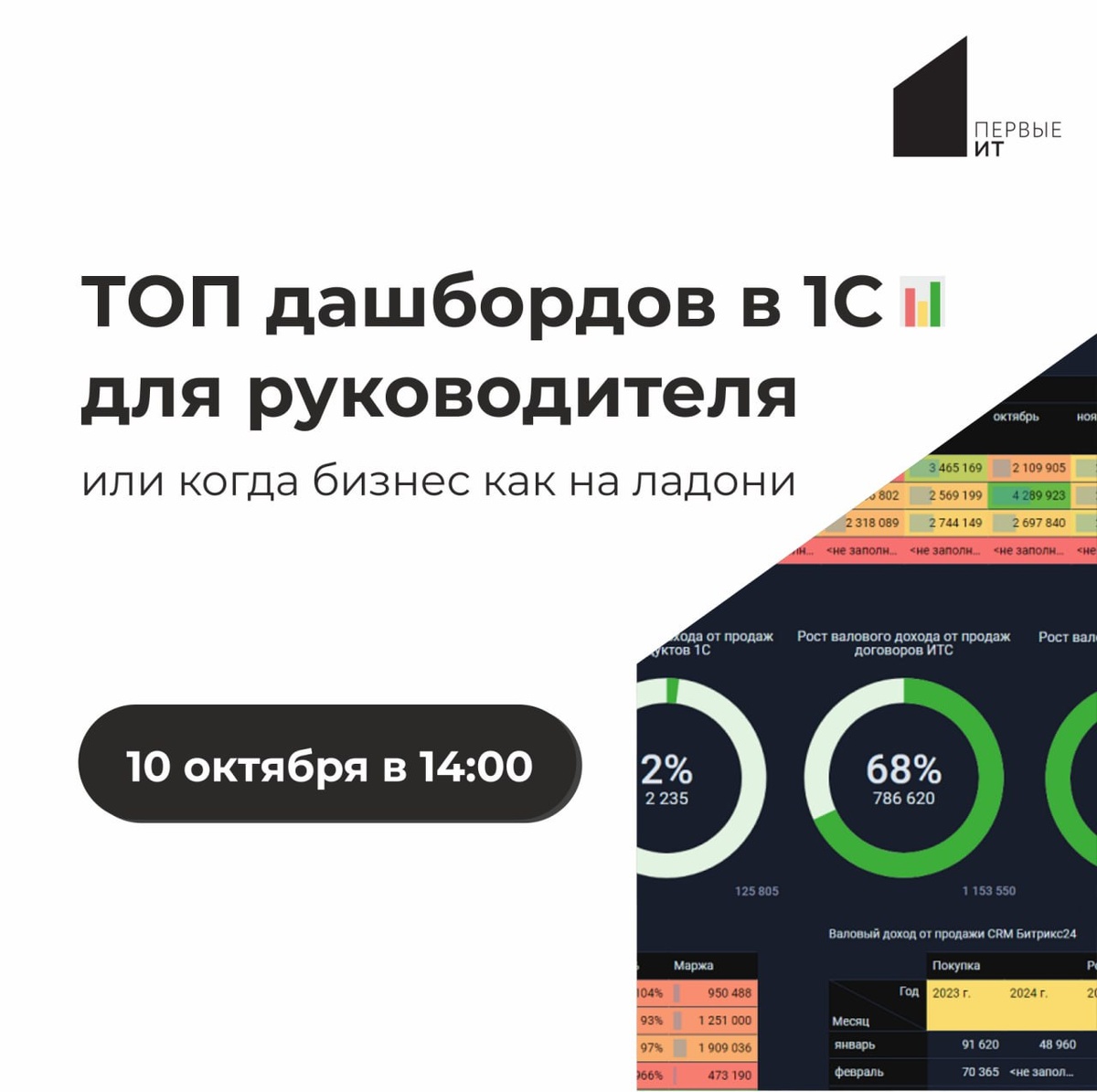 Приветствую, коллеги, и приглашаю вас на вебинар "ТОП ключевых дашбордов в 1С для руководителя" (https://clck.ru/3MgvBH), который перевернёт ваше представление об управлении компанией! 🗓 Дата: 10 октября в 14:00 МСК 🌐 Формат: онлайн-трансляция + Q&A сессия Что вы узнаете: ⚡️ Как превратить хаос данных в чёткую систему принятия решений ⚡️ Какие метрики действительно нужно отслеживать в бизнесе ⚡️ Как автоматизировать 80% рутинных отчётов и освободить время для стратегического планирования ⚡️Почему Excel больше не работает для серьёзного бизнеса и какие инструменты использовать вместо него ⚡️ Как сэкономить до 30% времени топ-менеджмента за счёт автоматизации и аналитики Практические кейсы: Разберем реальные кейсы по управленческим отчетам и дашбордам, которые были реализованы нами у клиентов Продемонстрируем, как в "живую" работает BI-система "1С:Аналитика"📈 🔥 Кому точно будет полезен вебинар: Руководителям, которые хотят видеть полную картину бизнеса и принимать обоснованные решен