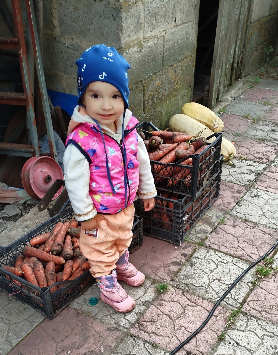 Дед выкапывал, отдавал Амелии, она приносила мне в кучу, я обрезала. И вот удивила Амелька меня в очередной раз. Пока всю морковь не переносила, не отвлеклась. Сева там по теплице лазил, землю ковырял, рассыпал. А Амелия упорно морковь носила.