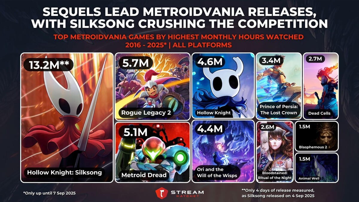Я уже делал пост про лучшие метроидвании 2025 года, а теперь посмотрим, какие еще хорошие игры этого жанра выходили в последние годы. В рамках большого исследования недавнего хита-метроидвании Hollow Knight: Silksong специалисты из аналитического агентства Stream Hatchet, которое занимается исследованиями игровых стримов, составили список самых рейтинговых метроидваний с 2016 по 2025 годы по количеству просмотренных часов на стриминговых площадках в их месяц релиза. В список попали игры, которым удалось собрать от 1.5 млн до 13 млн просмотренных часов в месяц выхода каждой игры. И опять мы видим нереальное преимущество этой игры над остальными проектами внутри жанра. Ведь она набрала не только больше остальных, но и сделала это не за месяц (как остальные), а за 4 дня! То есть если первая Hollow Knight набрала 4 600 000 просмотров в 2017 году за весь февраль, то Silksong превысила эту цифру почти в три раза, причем за несколько дней. Купить Hollow Knight: Silksong в Steam можно здесь: Р