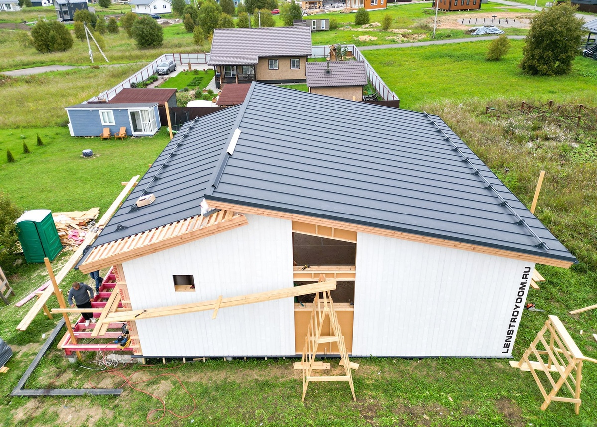 Результат работ по монтажу кровельного покрытия с применением фальцевой кровли "Grand Line" 0,5 мм, в цвете RAL 7024 на объекте в КП «Сочи», Ломоносовский район. Снаружи идут работы по внешней отделке дома скандинавской доской с ворсистой поверхностью 23х150 мм.