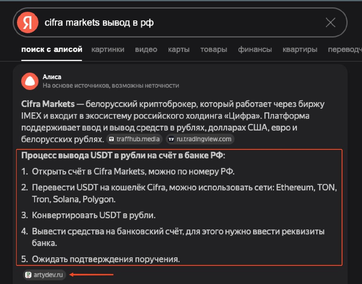 Инфа из поста есть в ИИ-сводке, а сама статья по запросам "cifra markets вывод в рф", "cifra markets гайд по выводу" на первой странице в топ-5 📈