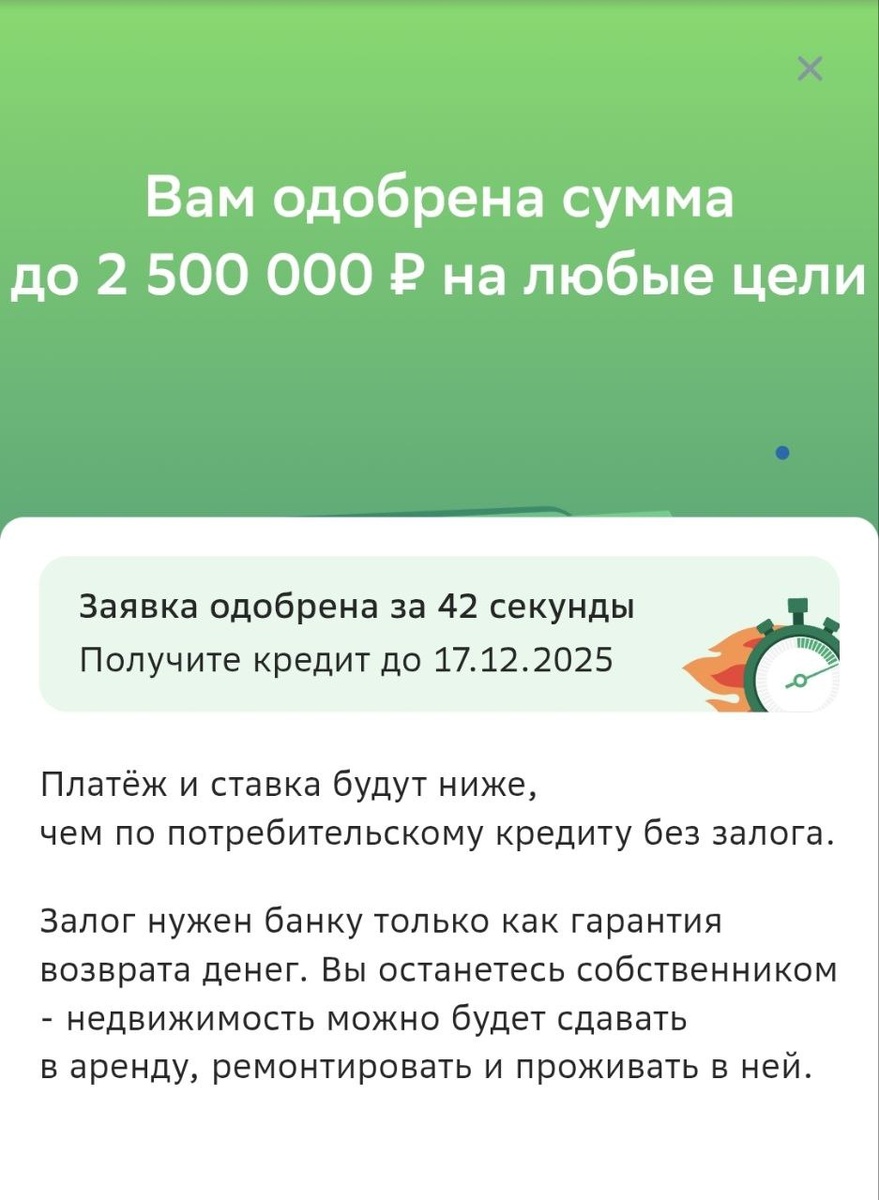 Одобрение банка по кредиту наличными под залог дома. Самое главное это то, что написано ниже середины!!! Сбербанк не просто читает мой канал, он его ЦИТИРУЕТ)! Ну если уже и Сбербанк понял то, что я пишу, то вы просто обязаны брать кредиты наличными только под залог недвижимости!