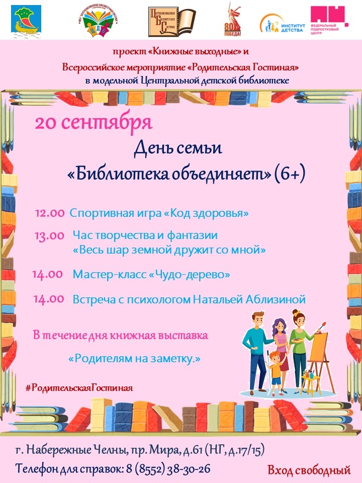 Дорогие друзья! 20 сентября модельная Центральная детская библиотека с радостью приглашает детей и их родителей провести субботний день вместе с нами! В рамках «Книжных выходных» и Всероссийского мероприятия «Родительская гостиная» мы организуем День семьи «Библиотека объединяет» где Вас ждут чтение, творчество и общение!