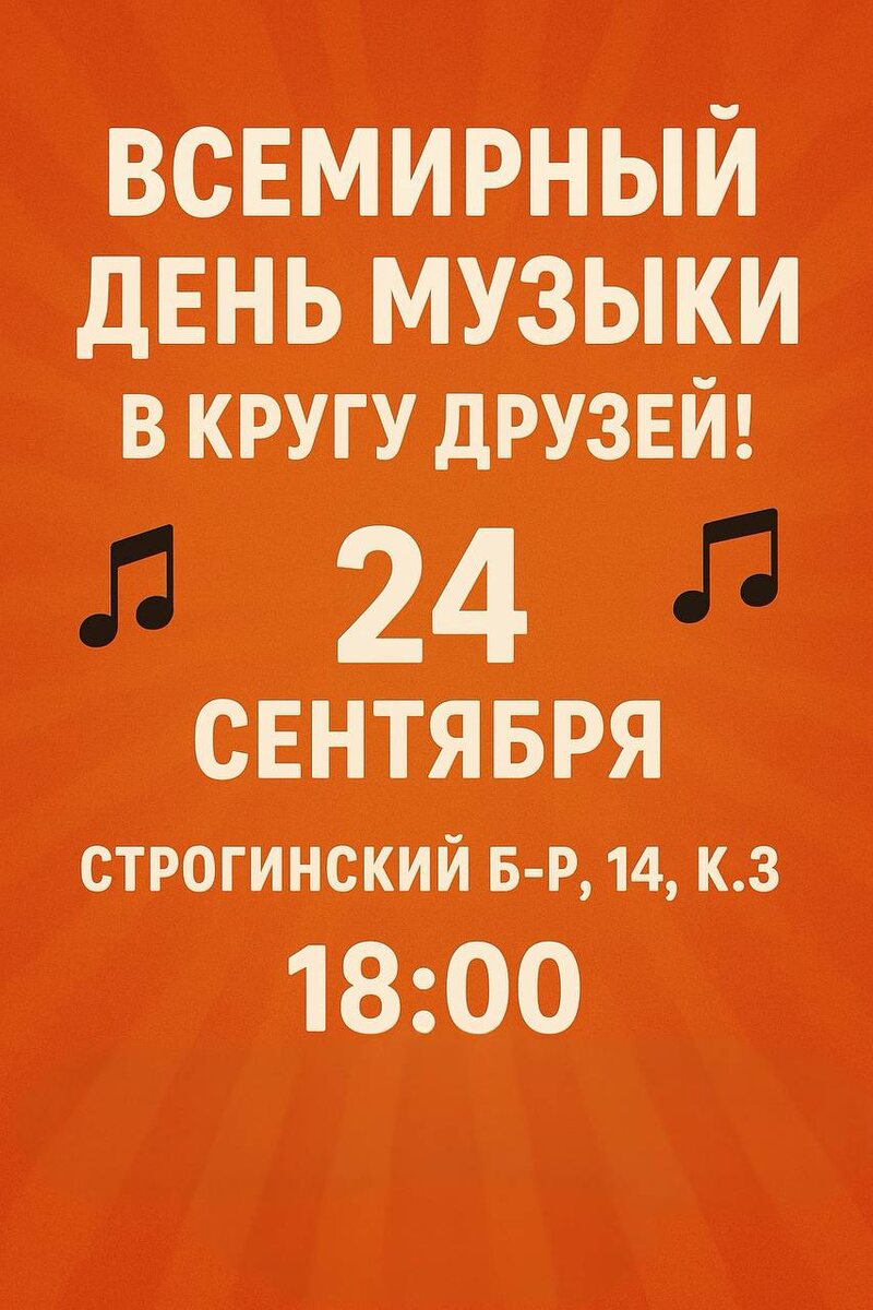 🎶 Всемирный день музыки в кругу друзей! 🎶 Друзья, приглашаем вас на особый музыкальный вечер! 🌟 Будет душевно, ярко и очень мелодично! 🎹❤️ ✨ В программе: 🔹 Живые музыкальные композиции разных жанров 🔹 Творческие мастер-классы для детей 🎨 🔹 Тёплая семейная атмосфера и вдохновение 💬 📍 Строгинский б-р, 14, к.3 📅 24 сентября ⏰ 18:00 Приходите всей семьёй — музыка объединяет! 💖 #ВсемирныйДеньМузыки #МузыкальныйВечер #Строгино #КультураСЗАО #ДосугМосква #БесплатныеМероприятия #СемейныйОтдых #ЖиваяМузыка #Творчество