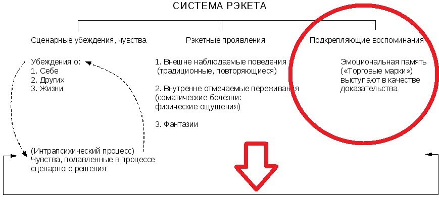 Подкрепляющие воспоминания. Находясь в сценарии, человек входит в контакт с воспоминаниями, которые усиливают сценарные убеждения. При этом в каждом из этих воспоминаний будут случаи, в которых он уже проигрывал сценарные убеждения и чувства. Воскресив в памяти подобные случаи, он будет показывать и соответствующее рэкетное проявление, испытывая рэкетное чувство или ведя себя в соответствии со своей Системой Рэкета. При воскрешении события вспоминаются также рэкетное чувство или другие рэкетные проявления. Другими словами, каждое подкрепляющее воспоминание сопровождается маркой. Эти воспоминания могут включать в себя реакцию других людей на рэкетные проявления самого человека, как это было в случае с девушками Михаила, которые бросали его в ответ на его агрессивное поведение. Это также могут быть реагирования, внутренне подтверждающие его сценарные убеждения, хотя в действительности они были нейтральными или даже противоречили этим убеждениям. Например, девушка могла пригласить Миха