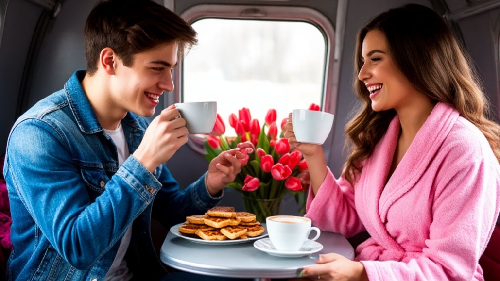 Захожу в свой отсек и что вы думаете я там увидел. Моя красотка уже в розовом халате сидела у окна не смотрела на машущих чужих провожающих. Девушку никто не провожал. Это вселило надежду на приятное знакомство. Девушка заняла нижнее место напротив моего нижнего. Поезд начал движение и стал выходить на крейсерскую скорость. Ещё два наших попутчика должны были подсесть к нам на следующей станции. Девушка сама предложила попить кофейку с печеньем, так сказать, за наше знакомство.