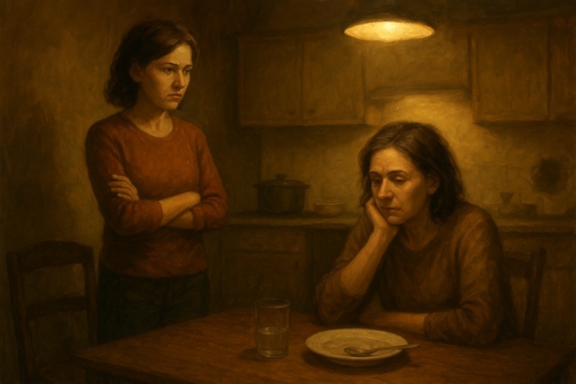 Анна сидела за столом, наблюдая, как Ольга бесшумно суетится у плиты. Всё в её движениях было напряжённым — будто каждая мелочь требовала контроля. Она быстро резала хлеб, ставила кастрюлю, поправляла ложки так, словно готовилась не к обычному ужину, а к экзамену.