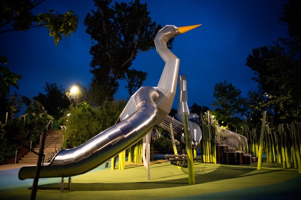 Парк Талсы, Оклахома, США. В сердце парка Талсы возвышаются две гигантские цапли, достигающие 12 метров в высоту, с захватывающими горками длиной 9 метров. Несмотря на изящный дизайн, конструкция оснащена прочным металлическим каркасом и глубокими фундаментами, чтобы стойко выдерживать капризы оклахомской погоды. Рядом красуется большая стилизованная рыба-пила, предлагающая игровые зоны как внутри, так и снаружи. Парк Алнвик, Нортумберленд, Великобритания .Эта фантастическая площадка в парке Алнвик поражает воображение: десять высоких башен (самая впечатляющая — 24 метра!) соединены запутанным лабиринтом мостов, переходов, веревочных лестниц и спусков. Главное очарование — в тематических украшениях, которые завершают картину: башни украшены колпаками, огромными еловыми ветвями, висящими шарами и резными окнами, а у основания — целая "грибная ферма" из каруселей и батутов. Сетчатый лес, Хаконе, Япония . Представьте площадку, которая одновременно служит музеем под открытым небом! Японск