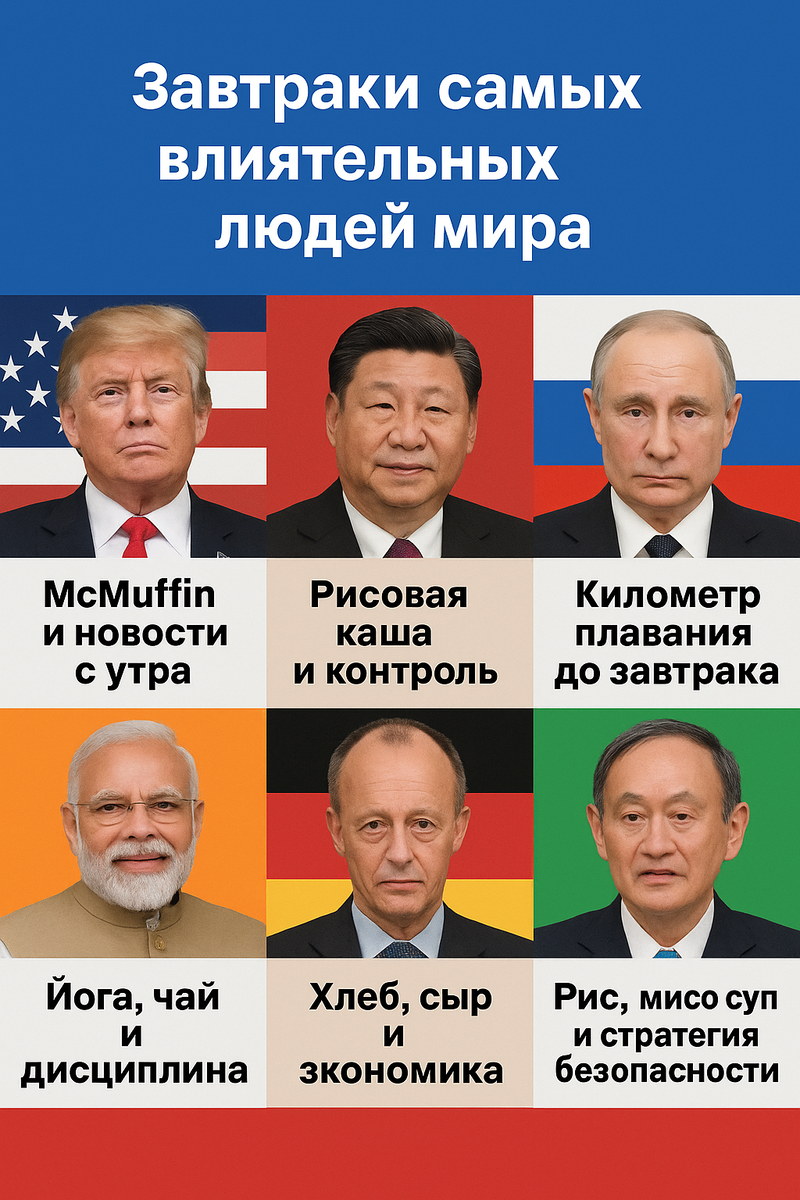 Эти лидеры не просто завтракают — они формируют повестку дня для всего мира. У каждого свой стиль: от йоги до плавания, от McMuffin до мисо-супа. Но всех объединяет одно — утро как точка силы, контроля и намерения.