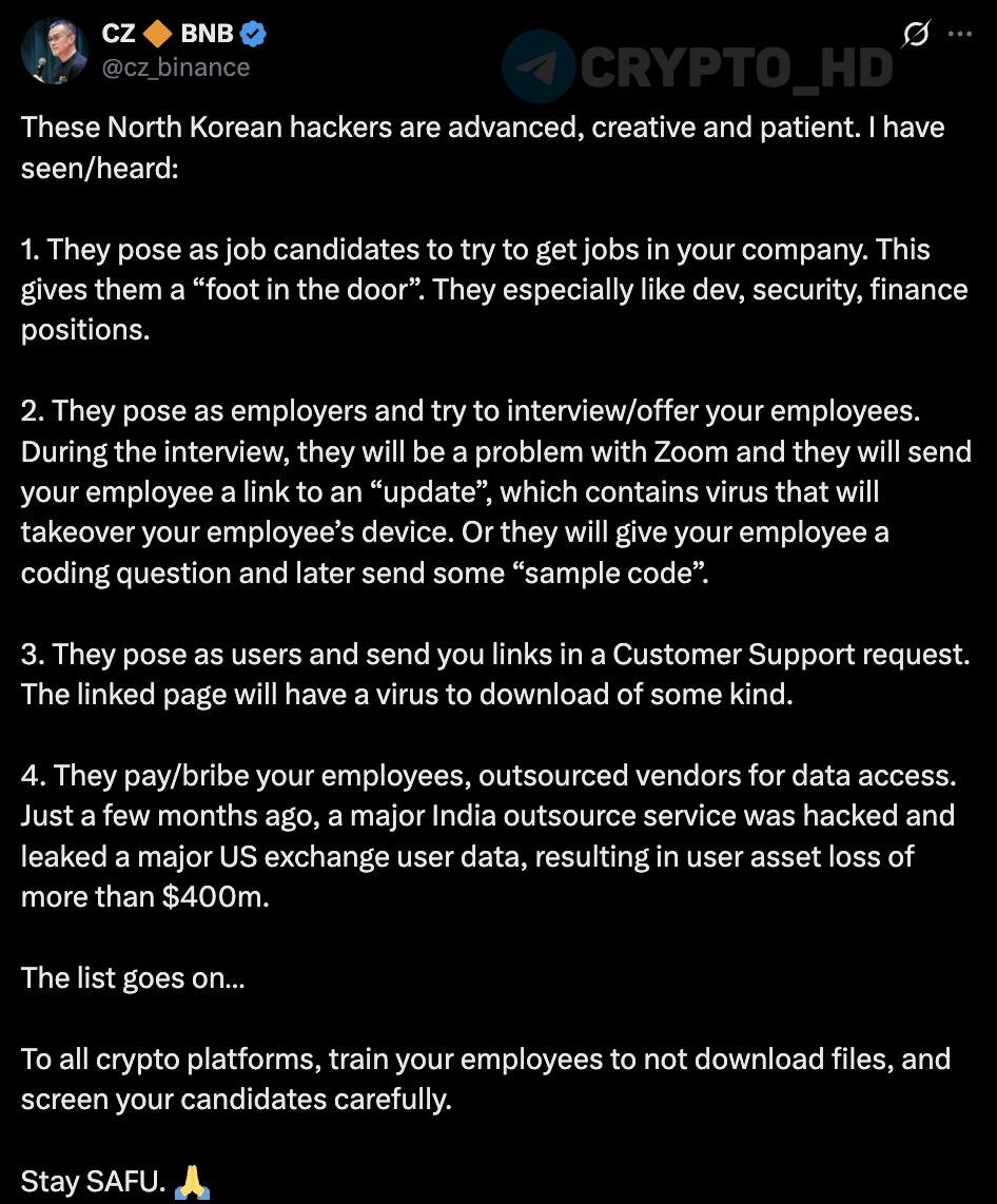 😐 Чанпэн Чжао: Северокорейские хакеры действуют все изощреннее. 1. Прикидываются кандидатами на работу, чтобы пролезть в компанию. 2. Выдают себя за работодателей – во время собеседования присылают «обновление» или «образец кода» с вирусом. 3. Маскируются под пользователей и кидают зараженные ссылки в саппорт. 4. Подкупают сотрудников и подрядчиков. Недавно из-за утечки в индийском аутсорс-сервисе пользователи крупной американской биржи потеряли $400,000,000+. Сryptо Headlines