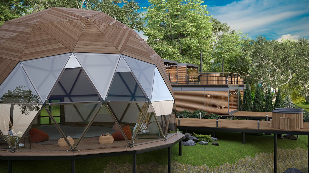 Формат: гостевые модульные домики, купели, банный комплекс, зал для йоги, гриль-зоны Общая площадь строений: 1 200 м²