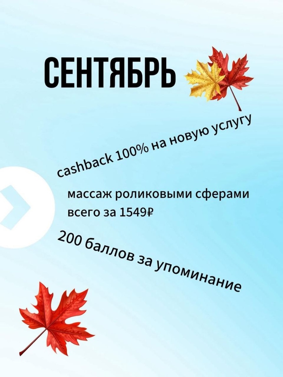 Мы в Laser Lab подготовили уникальные предложения в сентябре, которые вы точно не захотите пропустить! 🔸 Полный кэшбек за первое посещение! 🔸 Запишитесь на любую из наших новых услуг — и получите полную стоимость обратно в виде кэшбека! Новая услуга - это та, на которой вы еще ни разу у нас не были 😉 🔹 Массаж роликовыми сферами всего за 1549 рублей! Эта процедура — один из лучших способов достижения идеальных форм тела. Мы предлагаем абонементы по стоимости — 1549₽ вместо 2549. 🔸 Получите 200 баллов за упоминание! 🔸 Поделитесь с друзьями своими впечатлениями в сторис и получите 200 бонусных баллов на свой счет! Этот маленький шаг станет большим подарком — дополнительными баллами, которые можно использовать для следующих походов в Laser Lab! 📲🎁 💬 Порадуйте себя вниманием и заботой, а мы позаботимся обо всем остальном. Laser Lab — ваше место совершенства и удовольствий. До встречи в наших центрах! 💗 🕊Подробная информация у администратора. Запись на процедуры онлайн: http