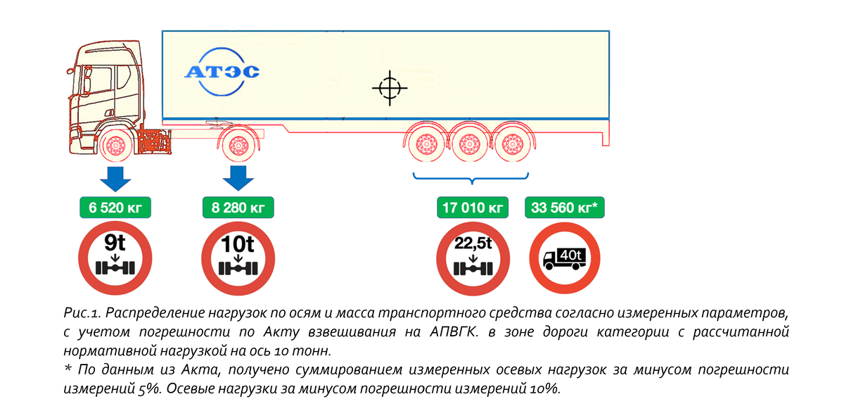 Классический пятиосный автопоезд в составе седельного тягача с колесной формулой 4Х2 и трехосного тентового полуприцепа в месте погрузки был загружен в соответствии с нормами для категории дорог с «рассчитанной нормативной нагрузки на ось» 10 тонн. (Рис.1)