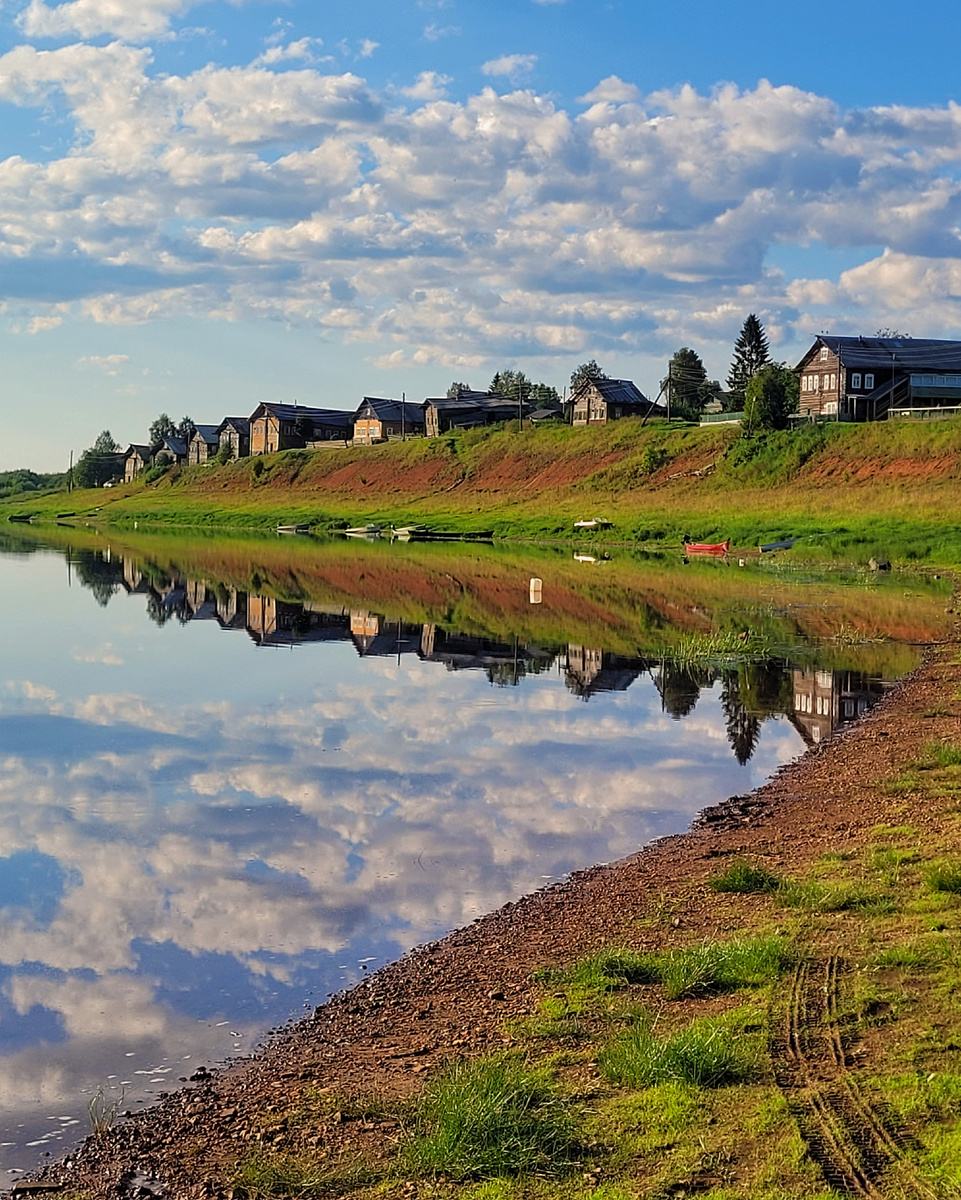 Показывала накануне Кимжу — вот тут. И сегодня о ней подробнее. Это деревня в Мезенском районе Архангельской области. И она очень колоритная. В ней не просто время замерло, а замерло красиво. Я прям ахнула, когда вышла на берег реки и увидела под облаками домики рядком на пригорке. ...воды и казались какими-то ненастоящими. Как декорации. Хоть кино снимай. А тут и снимали, кстати — «Матвееву радость» и «Михайло Ломоносова». В последнем Кимжа сыграла роль Холмогор. И на картинах она, и на марках, и в книгах, и на куче фотографий. ...и это мы ещё недолго были — так-то всю память в телефоне бы забила))) А появилась эта деревня в начале XVI века и вошла в историю как центр художественного литья. Здешние мастера делали из меди колокольчики для скота и почтовых лошадей, плюс украшения для конской сбруи. ...жители могли ворожить, заговаривать, насылать порчу и сглаз. Поэтому соседи называли их чернотропами — колдунами. Вот тоже любопытное — до середины XX века в Кимже не было кладбища и умер