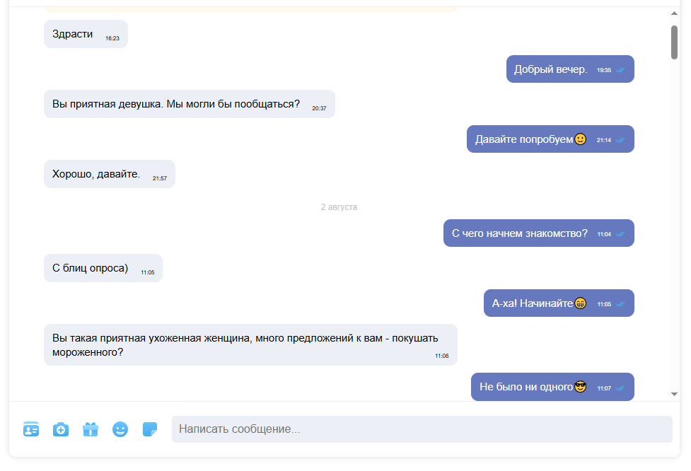 Я всегда скептически относилась к заявлениям, что на сайтах знакомств сидят не совсем адекватные люди. Это самое мягкое определение. Чаще выражаются резче. Судила по себе. Я ж нормальная и очень даже адекватная и сижу на сайте знакомств. Значит, нас там таких много. Но недавно я впервые (!) столкнулась с живым воплощением всех страшилок тех, кто сайты знакомств презирает и с удовольствием поливает грязью. Хотя начиналось все очень безобидно. Даже чувство юмора у него совпало с моим. Потом выяснилось, что этот мужчина не знает, что такое отношения и с этой наукой у него дела обстоят еще хуже, чем у меня👀 А вот дальше пошли уже первые странности. Знаете, я никогда не сталкивалась с людьми, которые считают себя непризнанными гениями. Я о таких только слышала. Но этот мужчина, его зовут Вадим, по личным ощущениям мнит о себе гораздо больше, чем есть на самом деле😏 При этом я продолжила знакомство, и оно перешло в вотсап. Наверное, потому, что слишком много было неизвестного в отношении