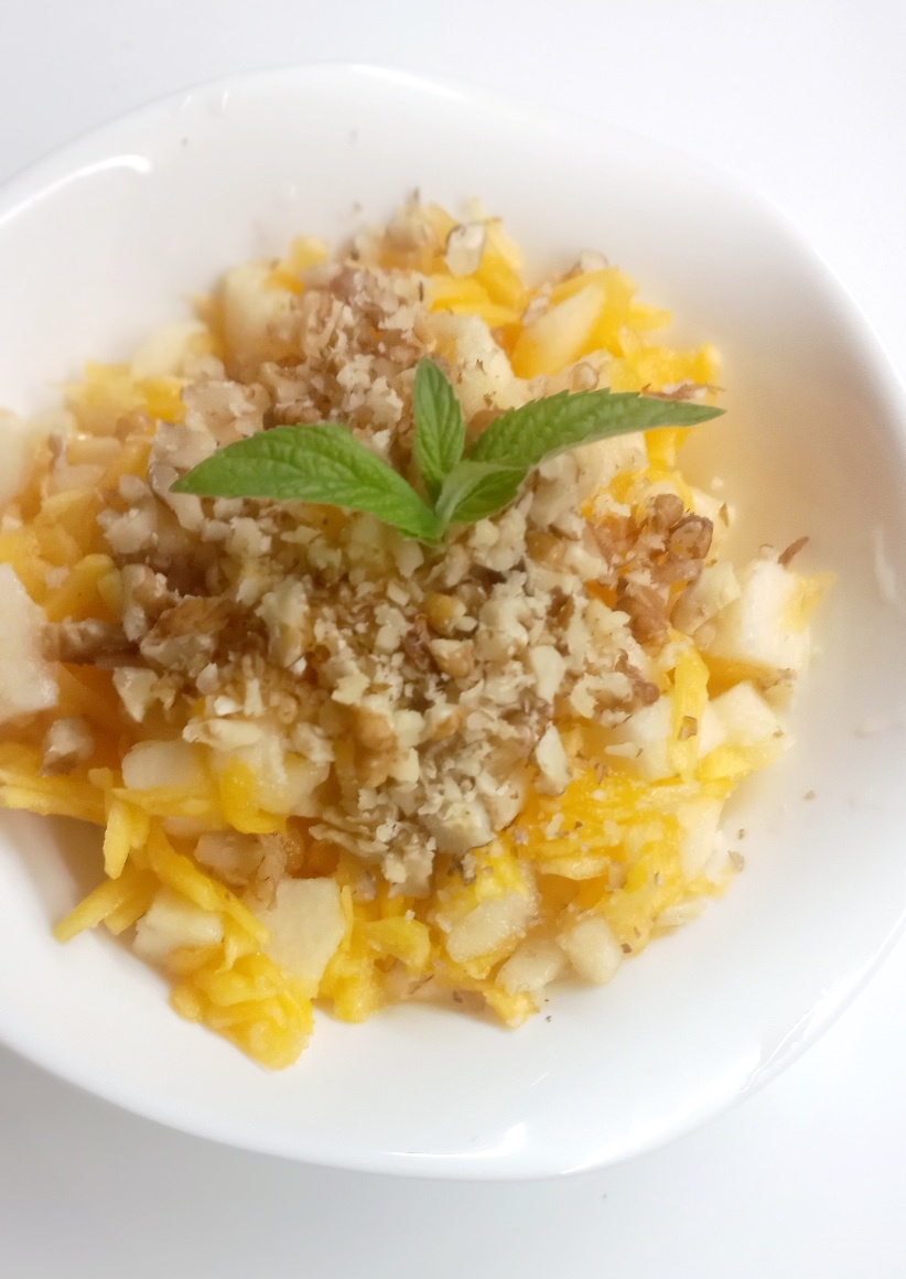 Впервые попробовала такое сочетание фруктов и мне так понравилось! Здесь царица полей в сыром виде. Кстати, я всегда при снятии кожуры с тыквы и нарезая ее для отваривания, съедаю кусочек в сыром виде - вкусно. О пользе тыквы писать излишне - всем это и так известно. Скажу только, что есть тыкву нужно как можно чаще и в любом виде. Благо хранится тыква прекрасно от урожая до урожая. В рецепты из неё мною уже представлены: блинчики, рагу, суп, запеканки, салаты, десерт. Итак, очищаем тыкву от кожуры. После этого натираем не на крупной тёрке. Там временем очищаем от кожуры грушу и тоже измельчаем. Но режем кубиками. Далее грецкие орехи измельчаем с помощью нлжа с широким лезвием. Сначала прижимаем плоской стороной- дадим. После этого нарезаем. Теперь берём жидкий мед. Если нет жидкого, берём твердый и слегка нагреваем его. Он становится жидким. Теперь соединяем все ингредиенты для салата, перемешиваем и поливаем жидким мёдом. Для украшения и дополнительного вкуса кладем нескольк