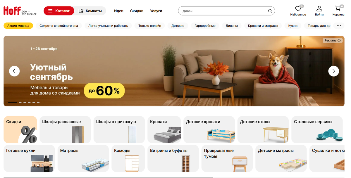 Крупный гипермаркет мебели и товаров для дома. Представлен широкий выбор мягкой и корпусной мебели, кухонь, матрасов, декора.