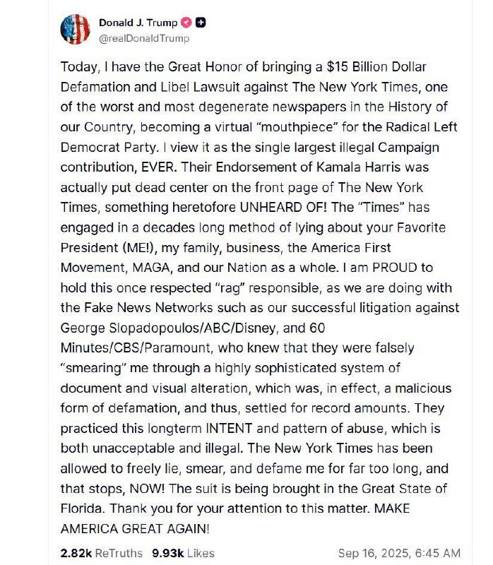 Дональд Трамп продолжает борьбу с неугодными. Теперь под его огненно-рыжий взор попали The New York Times. Президент США подал в суд и требует $15 млрд за «убитый» мемкоин TRUMP. По версии Трампа, статьи и книга журналистов, вышедшие в 2024 году, спровоцировали обвал курса токена почти на 90%. В моменте капитализация TRUMP достигала $73 млрд, но после публикаций резко обвалилась. Кроме того, президент США называет NYT «рупором демократов» и обвиняет издание в клевете и вмешательстве в выборы. Это уже четвёртый подобный иск за последние полтора года. Ещё Трамп заявил, что NYT «слишком долго позволяла свободно лгать, клеветать и порочить меня, и это прекратится немедленно». Забавно, что Дональд Трамп абсолютно не терпит нелояльных ему журналистов. Обычно он начинает хамить, как мы уже писали, угрожать и подавать на них в суд. Ещё во время первой избирательной кампании он буквально столкнул интернет-культуру и традиционные СМИ. И сейчас почти любой провал можно спихивать на СМИ, которы