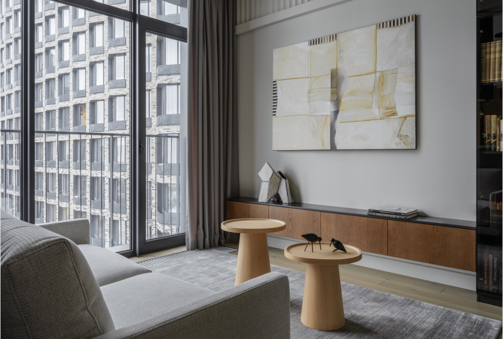 Эту квартиру в Москве дизайнер Дарья Макарова оформила по просьбе взрослой семейной пары. Заказчики хотели увидеть современный функциональный интерьер в спокойной природной гамме, — рассказывает она о проекте. — Среди достоинств я сразу отметила большие панорамные окна и возможность сделать распашную планировку. Общая площадь квартиры составляет 60 кв. метров. Мы объединили кухню с гостиной, расширили санузлы, сделали кабинет и убрали все коридоры, чтобы сделать пространство максимально функциональным. В основу проекта легла идея максимально сохранить воздух и свет в квартире за счет грамотного архитектурного решения: оно предполагало осевое расположение комнат и объединение основного пространства кухни-гостиной со спальней двойными распашными дверьми, раскрывающими перспективу. Для усиления производимого эффекта в торце спальни разместили картину, ставшую фокальной точкой в пространстве. В лаконичном интерьере преобладают спокойные природные тона. Простые, но точно подобранные отдел
