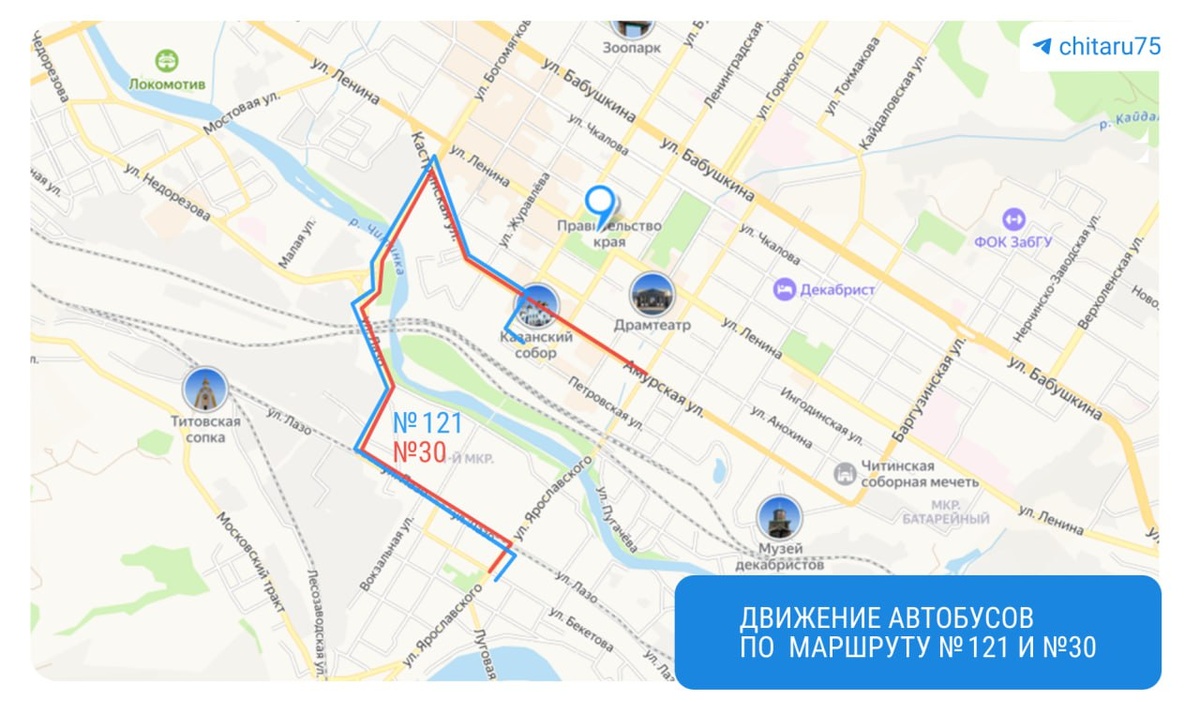 Несколько маршруток в Чите изменят свой маршрут на весь день. Дорогу на улице Лазо закроют с 08:00 19 сентября до 08:00 20 сентября. Будут менять настил на железнодорожном переезде в районе пересечения улиц Лазо и Ярославского, из-за этого шесть автобусов будут ездить по другому маршруту: 🟦Маршруты № 2, № 3, № 26, № 51: от ул. Ярославского в направлении ул. Амурской и обратно: ул. Ярославского — ул. Лазо — поворот в ГК № 36 — ул. Лазо — ул. Ярославского — далее по утвержденным схемам движения. 🟦 Маршрут № 30: от ул. Ярославского в направлении ул. Амурской и обратно: ул. Ярославского — ул. Лазо — ул. Богомягкова — ул. Кастринская — ул. Амурская — далее по утвержденной схеме движения. 🟦Маршрут № 121: от ул. Ярославского в направлении ул. Амурской и обратно: ул. Ярославского — ул. Лазо — ул. Богомягкова — ул. Кастринская — ул. Амурская — ул. Бутина — Вокзал. 📌📌 Предложить новость
